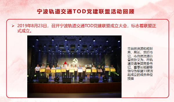 寧波軌道交通TOD黨建聯(lián)盟以TOD助推城市發(fā)展為目標,以軌道交通物業(yè)開發(fā)為主體,聯(lián)動沿線致力于軌道建設、城市開發(fā)的相關基層黨組織。2019年8月成立以來,通過資源共享、聯(lián)學互動,初步形成“共建、共創(chuàng)、共享、共贏”氛圍,黨組織、黨員的戰(zhàn)斗堡壘和先鋒模范作用有效發(fā)揮。